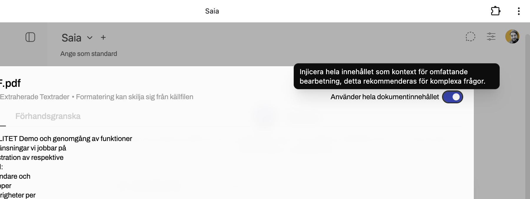 • Hela dokumentinnehållet: Saia läser och tar in hela dokumentinnehållet i kontexten. Detta är bra för lite kortare dokument eller när du vill att allt innehåll ska vara tillgängligt för AI-modellen.